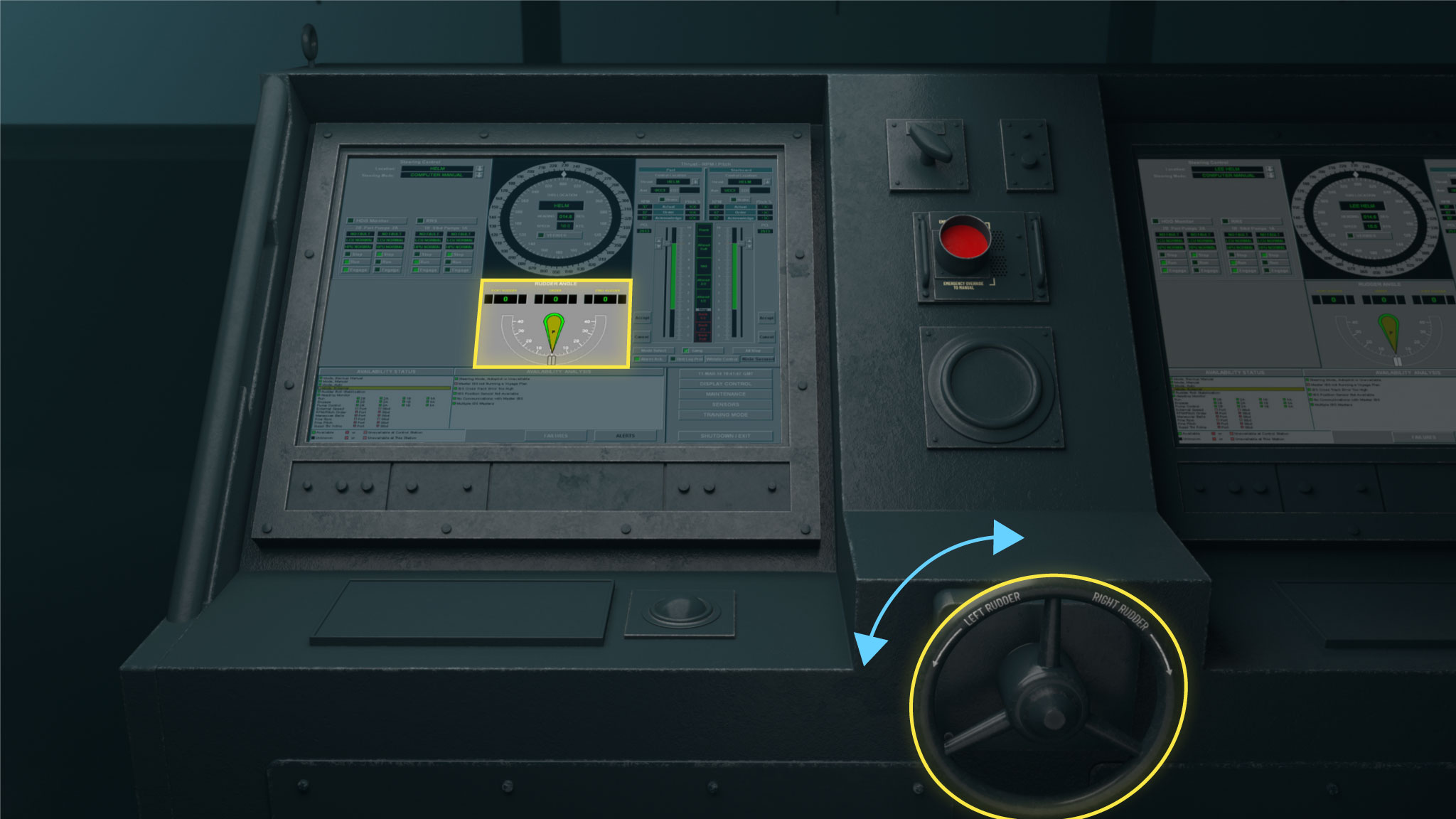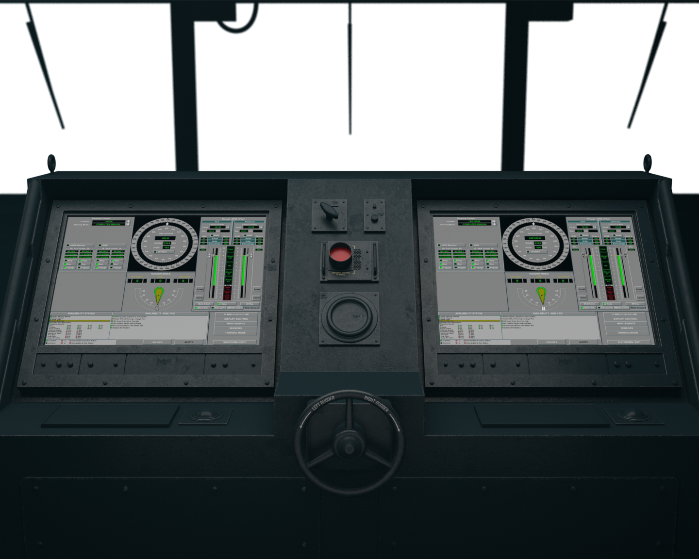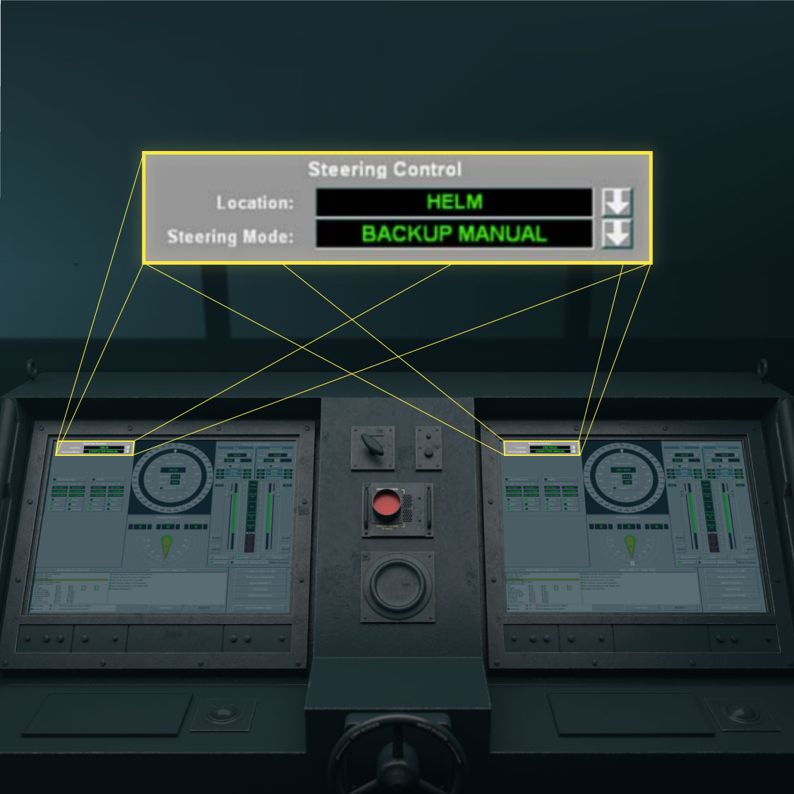 The helm and aft stations featured a fail-safe device known as the big red button. Once pressed, the big red button overrides all other stations and returns control to its own location.
