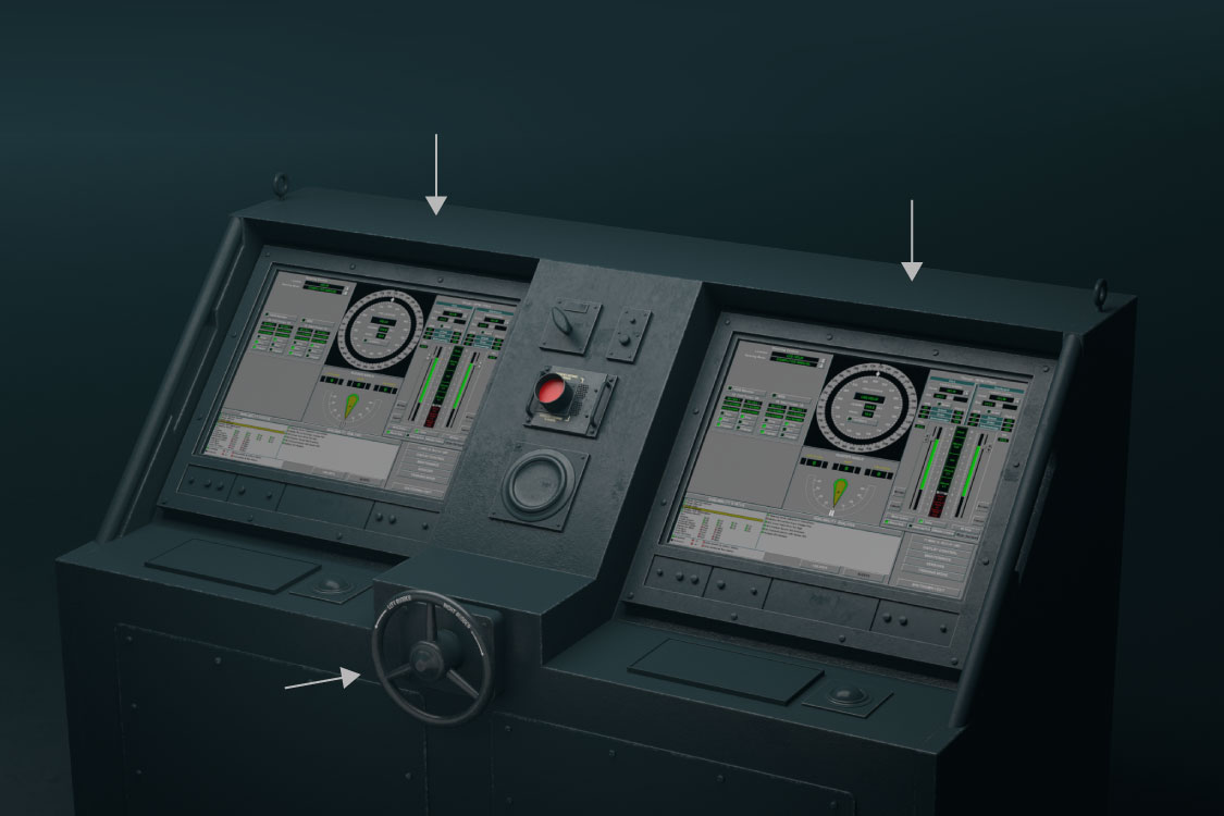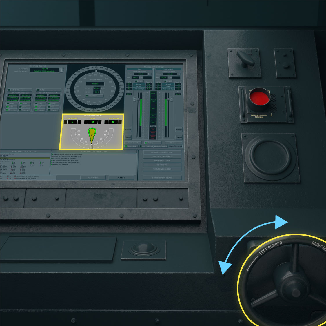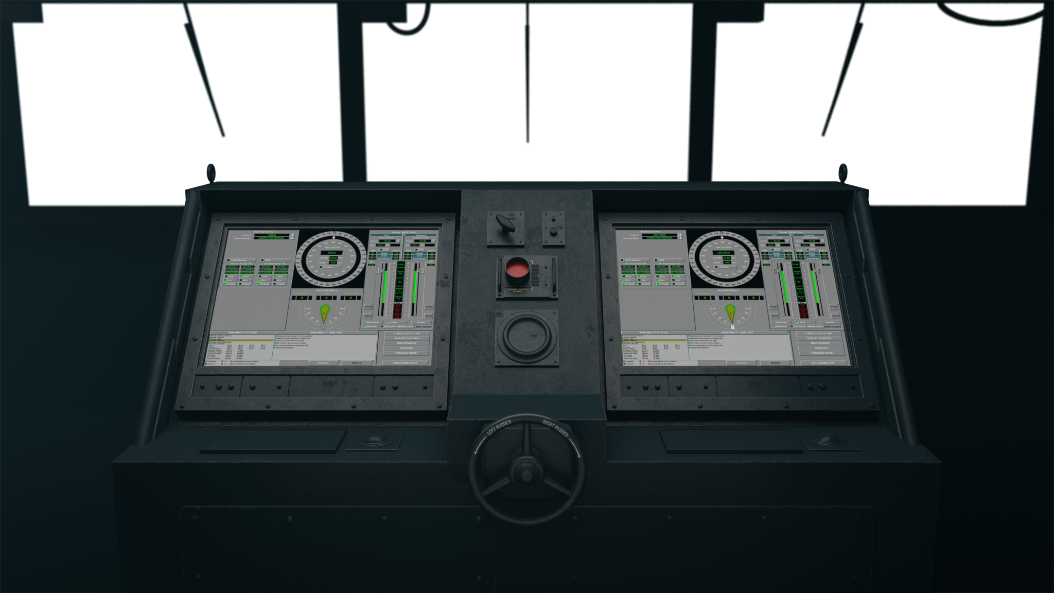 The helm and aft stations featured a fail-safe device known as the big red button. Once pressed, the big red button overrides all other stations and returns control to its own location.