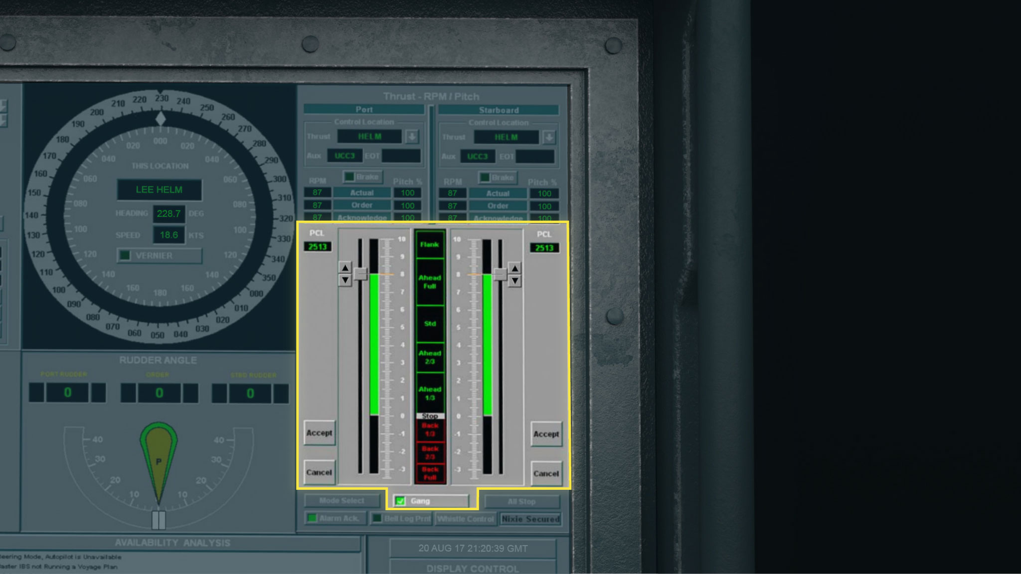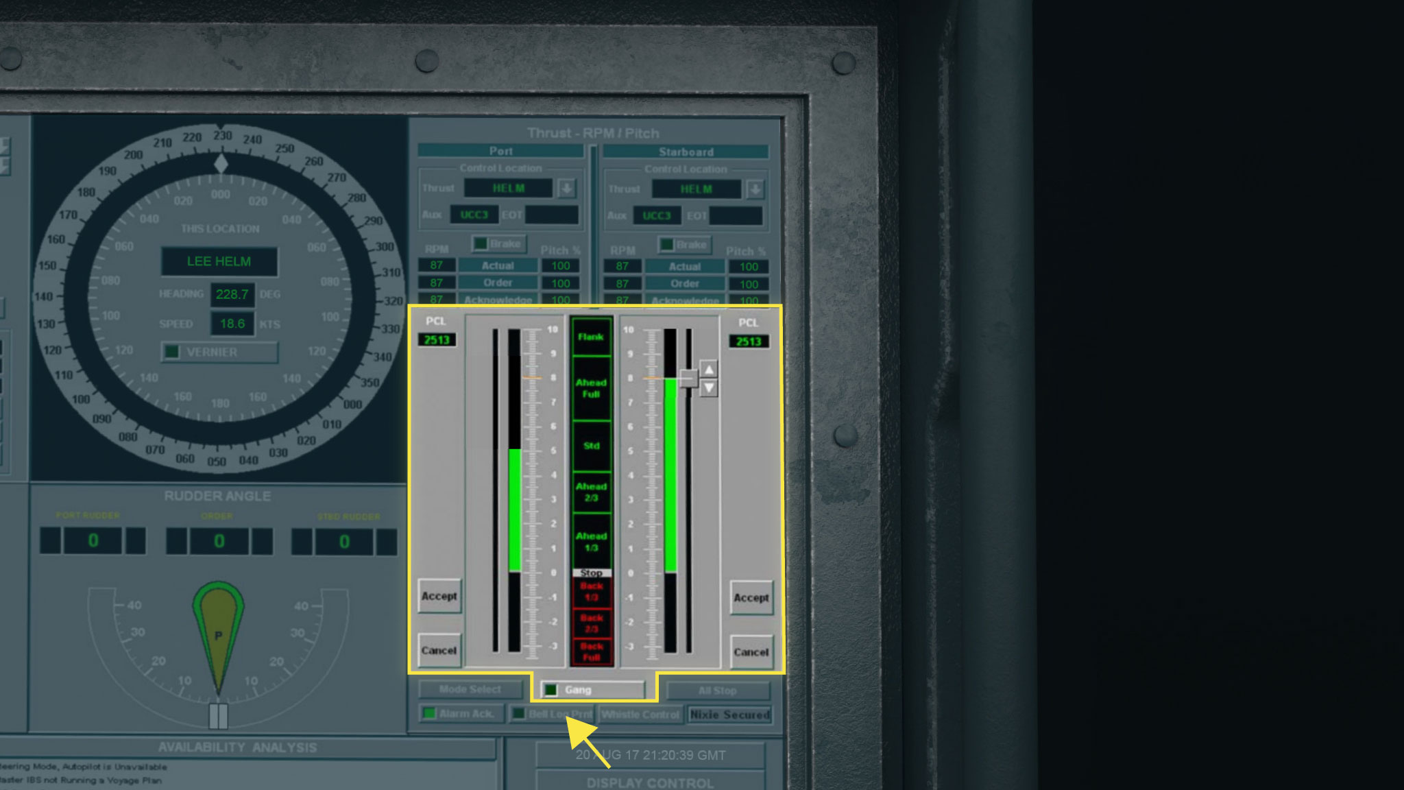 When Sanchez ordered the split helm, Gillilan leaned over the console to transfer control of the McCain’s speed to the lee helm. It was a two-step process that required Gillilan to transfer control of each of the McCain’s two main shafts.