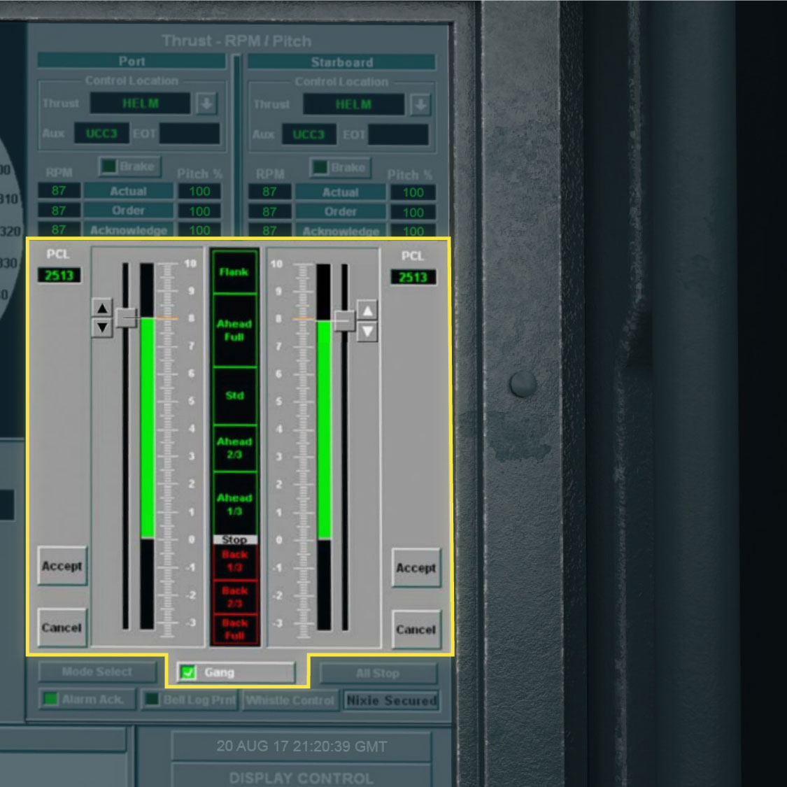 When Bordeaux had control of the speed, the McCain’s two propeller shafts were working together. If you slid the touch screen’s buttons to speed up one shaft, the other shaft automatically sped up as well.